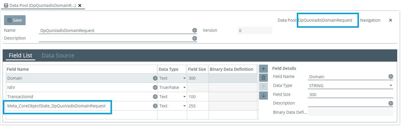 The data-pool must have the fields shown below. Pay special attention to the name of the Meta_CoreObjectState_-field which needs to end with the matching data-pool name: