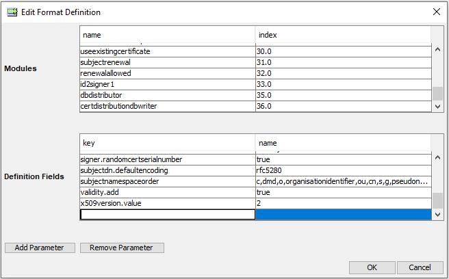 To add new format definition fields or modules click Add Parameter or Add Module. For added fields and modules (that are not present in the format file) you can edit values in the left column and also remove the row with Remove Parameter or Remove Module.