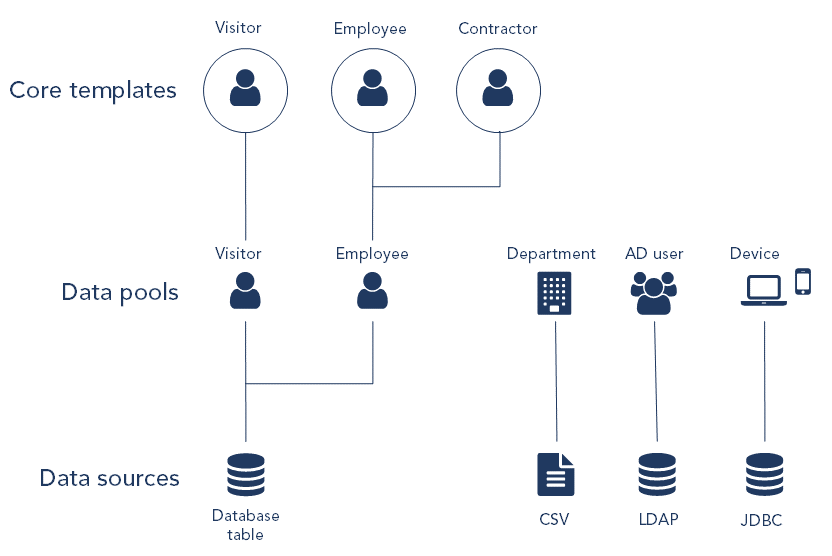 Data sources in Smart ID Identity Manager provide the connection to the data stored in internal tables in Identity Manager or any external source, such as LDAP, JDBC, SCIM or CSV files. In order to access the data sources, data pools are needed. Data pools are abstract representations of the data including lists of fields and their data types. The core templates are are an interpretation of the data pools. They are used for defining the core objects in Identity Manager, for example, cards, persons and so on.