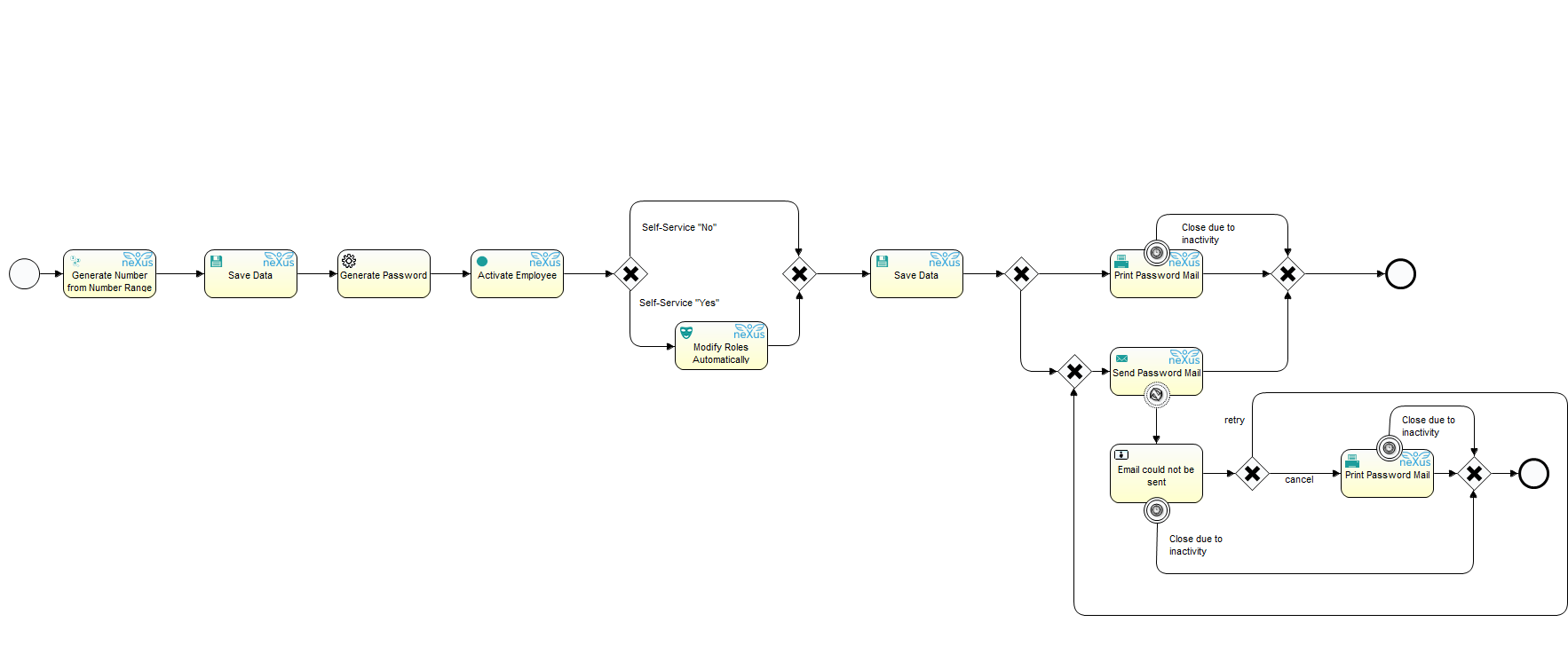 If a user task "Print Password Mail" is open for more than 2 minutes (without any user interaction), a timer boundary event will automatically close the process.