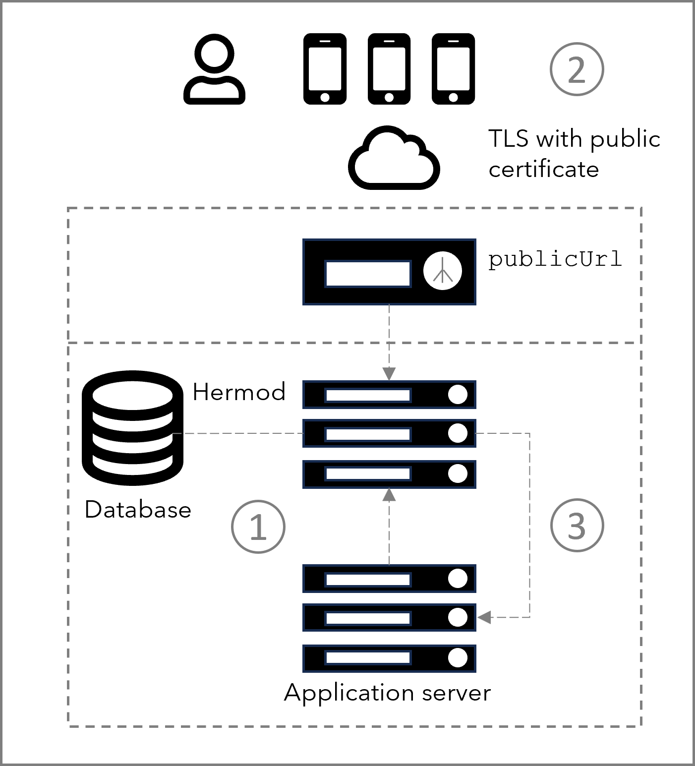 This article describes the architecture of Hermod component of Smart ID Messaging and how it interacts with an application server (AS), for example Smart ID Identity Manager. The database must be configured before you start installing Hermod. TLS should be configured in the Hermod configuration file.