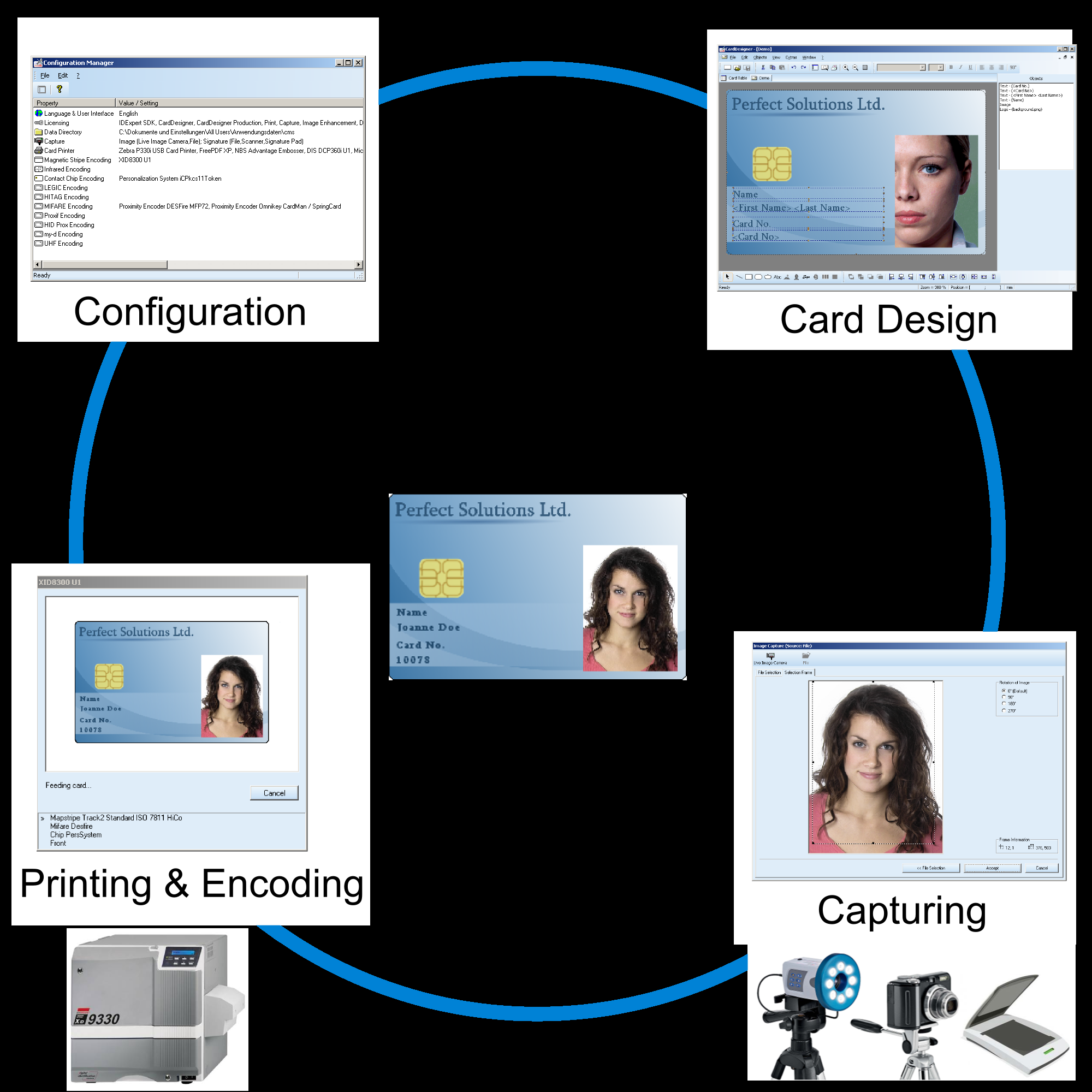 The Production Component to print and to encode ID cards. We support all ID card printers for ID1, ID2 and ID3 cards for which a windows printer driver is available. Standard laser or inkjet printers for paper badges may also be used. Chip encoding can be done printer integrated or with standalone devices. The SDK supports the encoding of contactless RFID chips as well as contact chip Smartcards for a Public Key Infrastructure (PKI). However, printing and chip encoding are separate features. You may use them combined or separately.