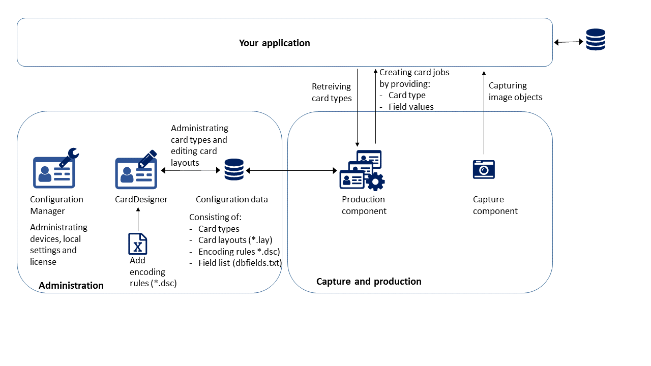 The Capture component is an independent component to capture images at any time before production. Your application stores the pictures as file references or the binary data itself (for example, as BLOB). When producing the card, your application provides the image data to the production component, just as the textual data.