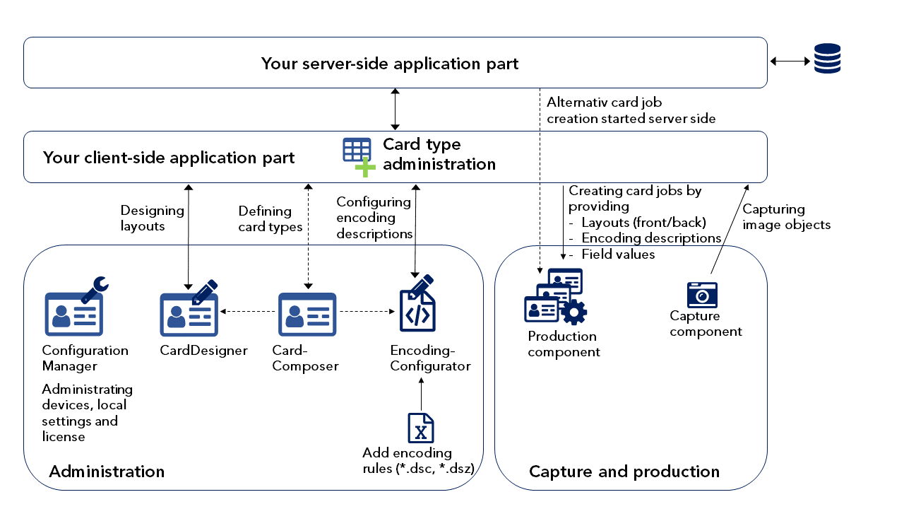 The administration of card types is done by your application using the CardDesigner/EncodingConfigurator or CardComposer. The CardDesigner is only used to design the layouts. No data is stored locally. Your application has to store and manage card types itself. Production is done by creating a card job with layout data, encoding description data, variable text and image data. In this mode, no local files are referenced - all data is exchanged between your application and the components.