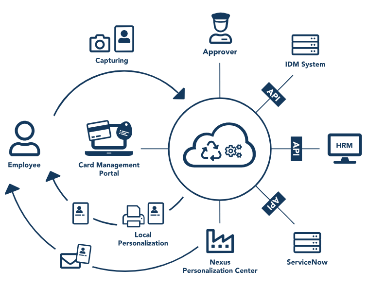 You can integrate an HR system, IDM system, or access control system with the Nexus GO Cards management portal through a REST API. Read more here: Card ordering API.