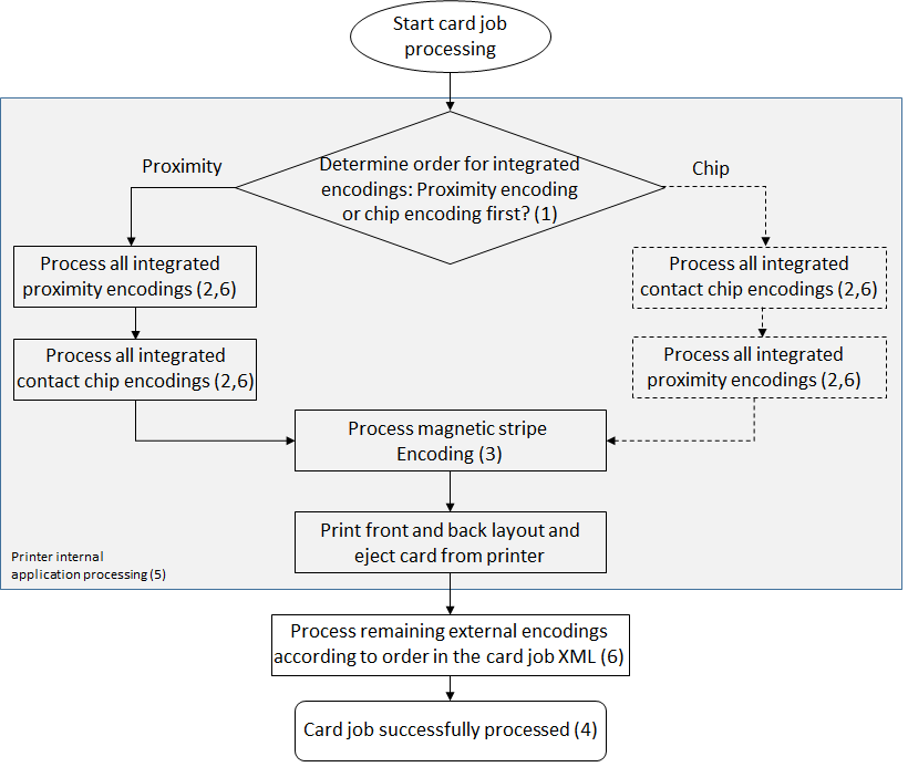 This example is a simplified one, describing a card job that contains one encoding and card printing (card front and/or back). This may actually cover a wide range of use cases. However, the complete sequence for card jobs containing any number of applications is described comprehensively and in detail under heading "Card job application processing order" in this article.
