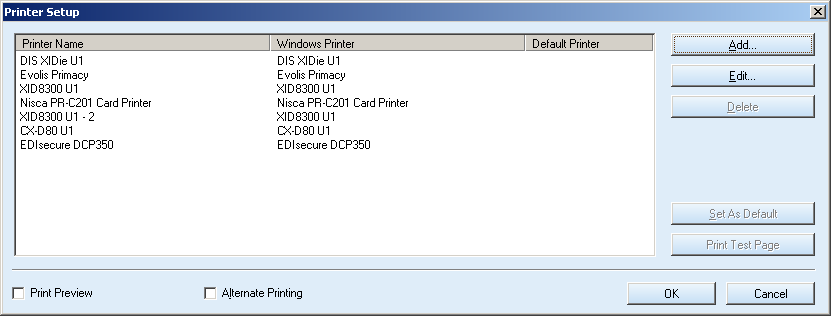 Note: Especially when using this feature in combination with a Client server architecture, it may make sense to change the locally configured printer names, which are originally generated from the Windows' printers, to names like First Printer, Second Printer or Printer with Standard PVC Cards, Printer with Mifare Cards, ... This allows to configure multiple workplaces with different printer models or printers containing different materials, but accessing them using a unique server side generated card job.