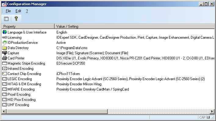 This topic describes how to configure an encoding device, guided by the Configuration Manager. The two device situations described in "Create one card job for all applications" are used. In both cases, the printer configuration is the same, only the encoding device configuration is different.