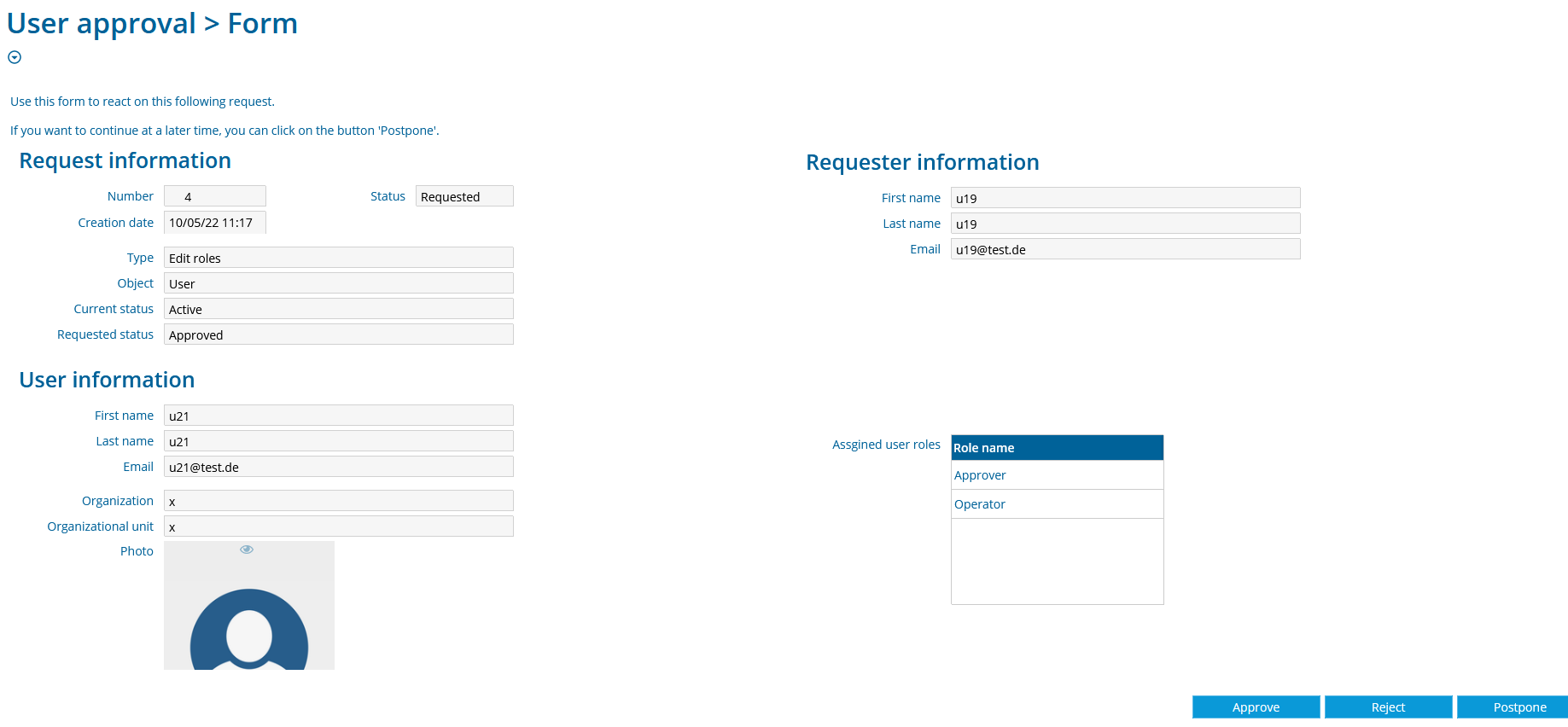 This is an example of how it can look like for an approver, when a request needs to be approved or rejected: