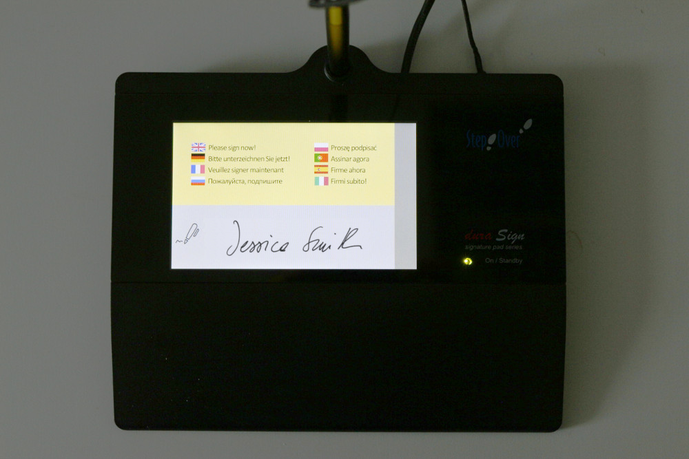 Supported and tested device from StepOver is the "duraSign Pad Brilliance" model. Other models may also work as they use the same driver. Special features of the duraSign Pad Brilliance are the hardened glass surface and the customizable surface background. Software interface is the StepOver TWAIN driver. For more information, see https://www.stepover.com/