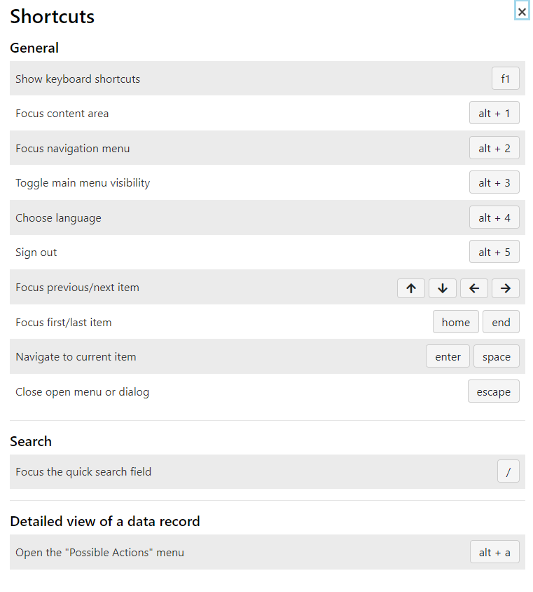 Keyboard navigation is available in Smart ID Self-Service to improve accessibility for the users. By clicking the keyboard icon the bottom left corner of the window (available for all views when you are logged in), you get access to the Shortcuts menu and all available shortcuts you can use to navigate in the different areas and views of Smart ID Self-Service. You can also access the Shortcuts menu by pressing F1. See the screenshot below.