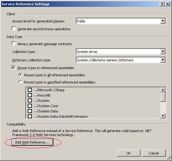 The Service Reference Settings dialog opens. Click Add Web Reference...